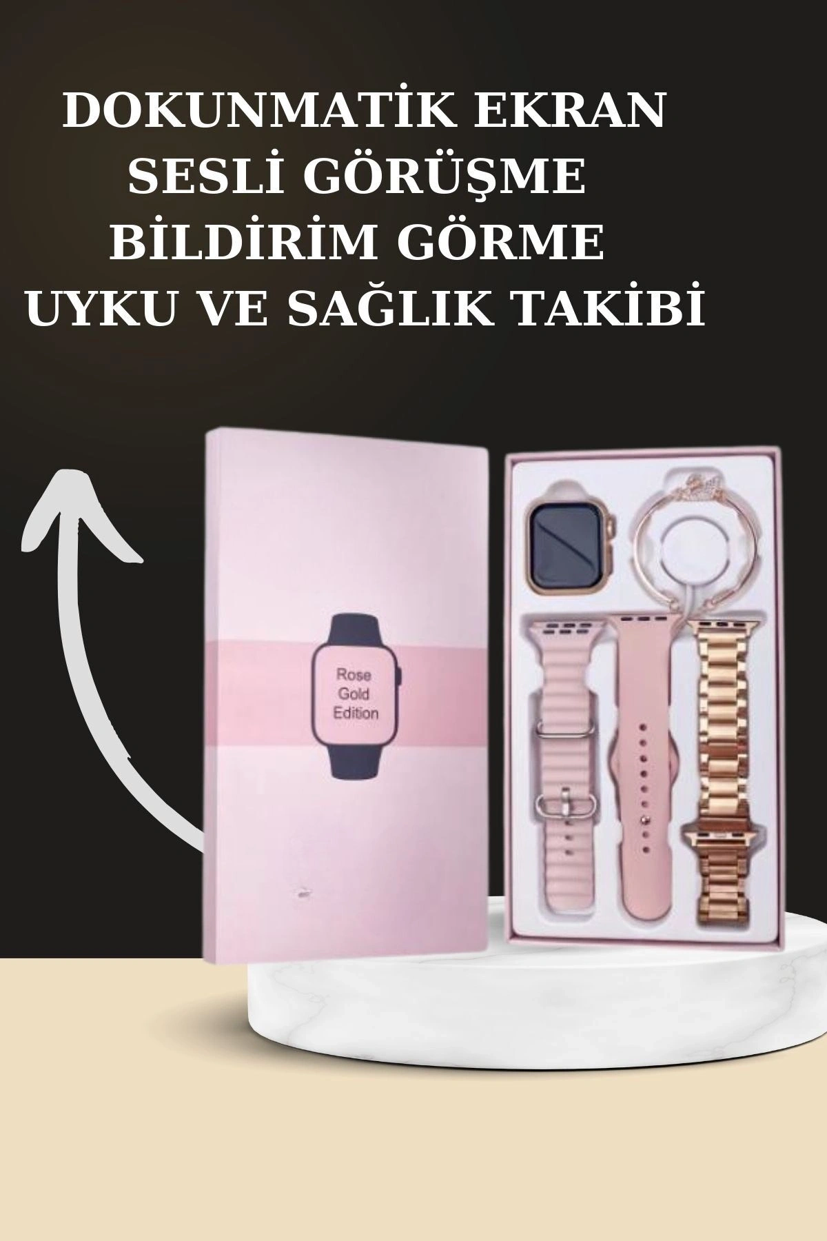 AKILLI SAAT Yeni Nesil Mini Kadın Akıllı Saat, şıklığı ve fonksiyonelliği bir araya getiren tasarımıyla kadınlar için ideal bir seçenek sunuyor.; Almanya üretimi ultra dayanıklı model, özel wireless şarj özellikleriyle öne çıkıyor ve Türkçe menüsü sayesinde kullanıcı dostudur.; Kutu içeriğinde, mini akıllı saat, 3 farklı kordon, hediye bileklik, wireless şarj kablosu ve kullanım kılavuzu bulunmaktadır.; Şık pembe kutusu, hediye olarak tercih edilmesini sağlayan bir özellik taşır.; 41 mm kavisli oval kenarlı yeni tasarımı ve 1,70 inç AMOLED ekranı ile yüksek çözünürlükte HD görüntü sağlar.; Saat, nabız ölçer, uyku izleyici, kan basıncı, tansiyon, EKG ve vücut sıcaklığı ölçer gibi sağlık izleme özellikleriyle sağlığınızı takip etmenizi sağlar.; 117 farklı spor modu ve adım, kalori, kalp ritmi ölçme gibi özellikler ile aktivite takibini oldukça detaylı yapabilirsiniz.; Ayrıca akıllı hatırlatıcılar sayesinde su içme ve hareketsizlik gibi hatırlatmalar alabilir, tüm bildirimleri ve mesajları anında saatinizde görebilirsiniz.; Bluetooth bağlantısı ile yüksek kaliteli müzik dinleyebilir ve uzaktan fotoğraf çekme özelliği ile fotoğraflarınızı kolayca çekebilirsiniz.; Suya dayanıklı yapısı, günlük kullanımda sıklıkla tercih edilmesini sağlar; ancak deniz ve havuz gibi basınçlı suya karşı su geçirmez.; Saatin sunduğu diğer özellikler arasında Türkçe ve çoklu dil desteği, saatimi bul, telefonumu bul, alarm, kronometre, hava durumu, hesap makinesi gibi fonksiyonlar bulunur.; Kordonu değiştirilebilir, bu sayede kişisel tercihlere göre tasarımı özelleştirilebilir.; 24 ay garanti süresi ile kullanıcılarına güvenli bir deneyim sunar.; KULAKLIK Dahili mikrofonu sayesinde eller serbest aramalar yapabilir ve net bir iletişim deneyimi yaşayabilirsiniz.; Dokunmatik kontrol özelliği ile müzikleriniz arasında kolayca geçiş yapabilir ve çağrılarınızı pratik bir şekilde yönetebilirsiniz.; Suya ve tere karşı dayanıklı yapısı, spor aktiviteleri veya yağmurlu hava koşullarında rahat kullanım sağlar.; Çift telefon desteği sayesinde iki farklı cihaz arasında kesintisiz geçiş yapabilir, hem iş hem de kişisel kullanım için ideal bir çözüm sunar.; Aktif gürültü önleme (ANC) özelliği ile dış ortam gürültüsünü engelleyerek müziğinize tam anlamıyla odaklanmanıza yardımcı olur.