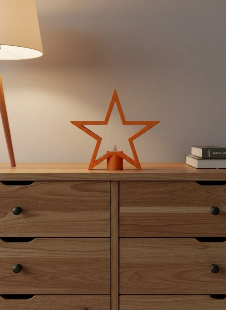 Dekoratif turuncu yıldız mumluk, loş aydınlatma sevenler için estetik ve işlevsel bir ev aksesuarıdır. Raf üstü, masa veya sehpa üzerinde kullanıldığında dekorasyona derinlik ve karakter kazandırır. Mum ışığının yumuşak yansımasıyla salonlarda cozy bir ambiyans oluşturur ve mekâna sıcak bir dokunuş ekler.