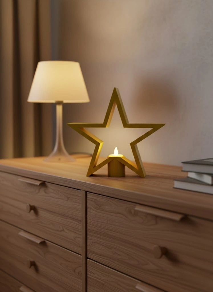 Yıldız formundaki bu sarı mumluk, sade ama dikkat çekici tasarımıyla ev dekorasyonunu tamamlar. Mum alevinin yaydığı yumuşak ışık, akşam saatlerinde huzurlu ve cozy bir ortam sağlar. Modern, bohem ve minimal dekorasyon stilleriyle uyumlu yapısı sayesinde farklı alanlarda kolayca kombinlenebilir. Günlük kullanımın yanı sıra özel gün süslemeleri için de idealdir.