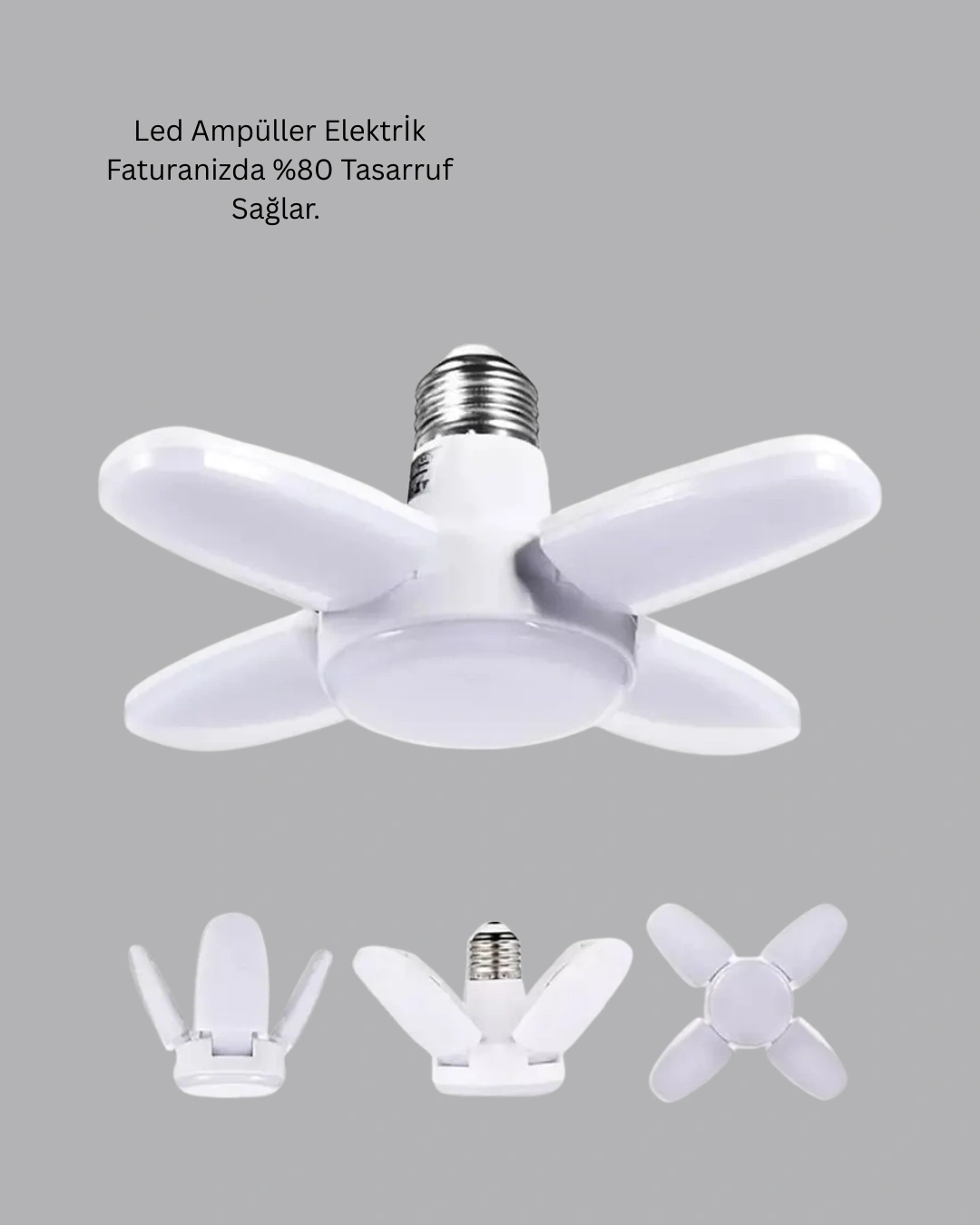 Enerji tasarruflu 4 kollu katlanır pervane LED ampül, yüksek ışık gücü ile maksimum performans sunar. 6000 lumen aydınlatma kapasitesi, karanlık alanları saniyeler içinde aydınlatırken beyaz ışık rengi net ve doğal bir görüş sağlar. LED teknolojisi, düşük enerji tüketimi ile çevre dostu bir kullanım sunar ve elektrik faturasında ciddi tasarruf sağlar. 60 Watt gücüyle klasik yüksek wattlı ampullerin yerini rahatlıkla alır. Katlanabilir kolları sayesinde ışık dağılımı dengeli ve geniş açılıdır. Kolay montaj özelliği sayesinde ekstra tesisat gerektirmez. Dayanıklı malzemesi uzun süreli kullanım için uygundur. Ev, ofis, depo ve ticari alanlarda güvenle tercih edilebilir.